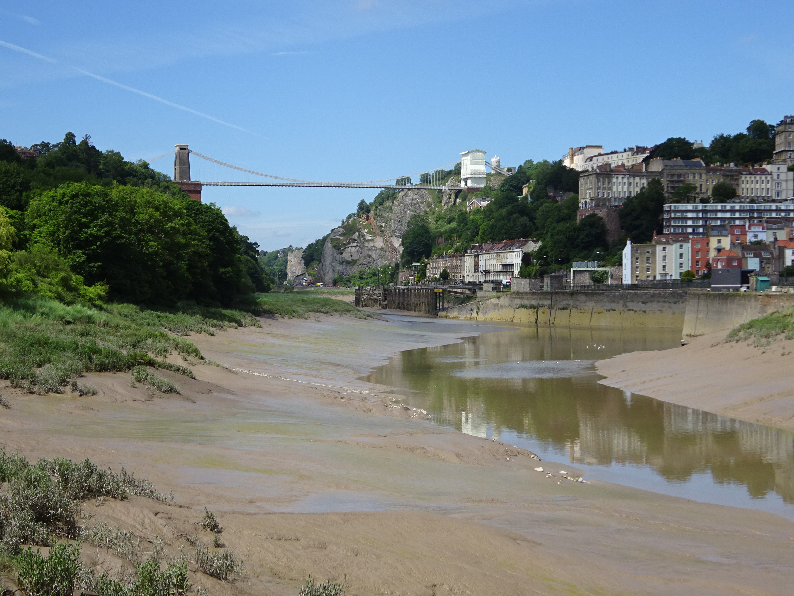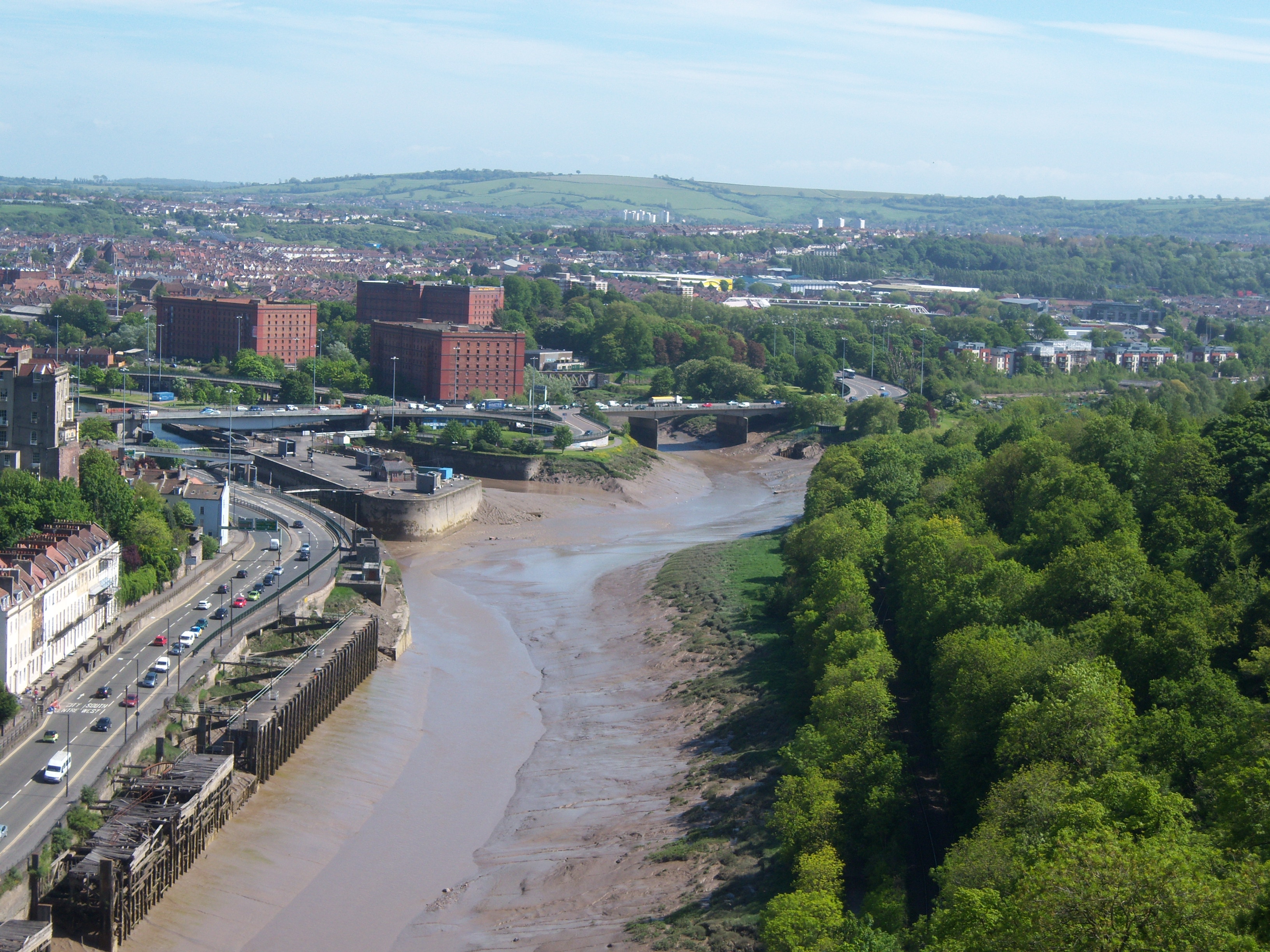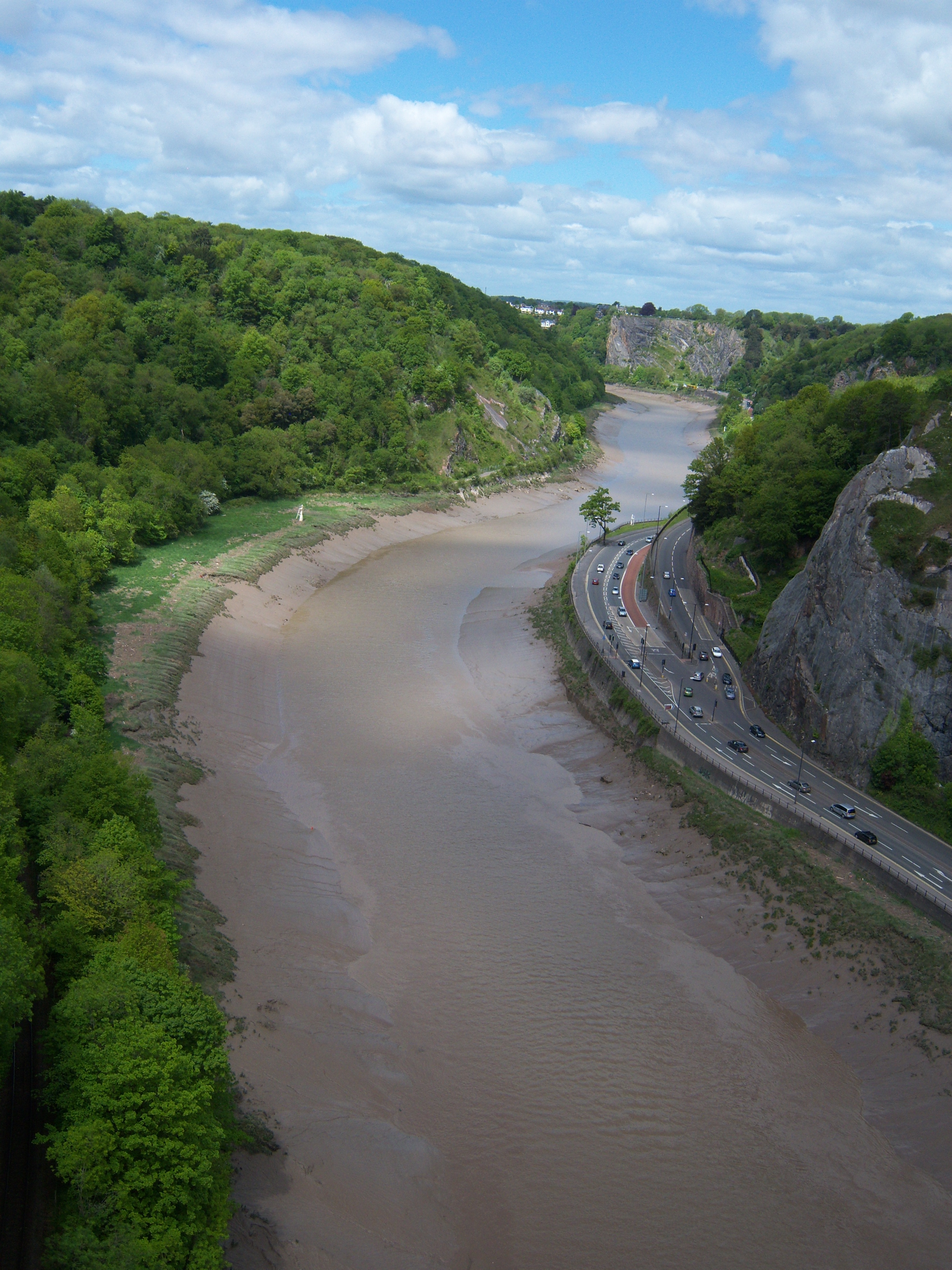 | The Avon downstream from the Suspension Bridge. On the right, Bridge Valley Road climbs up to the zoo; "Seawalls" is in the distance. | |