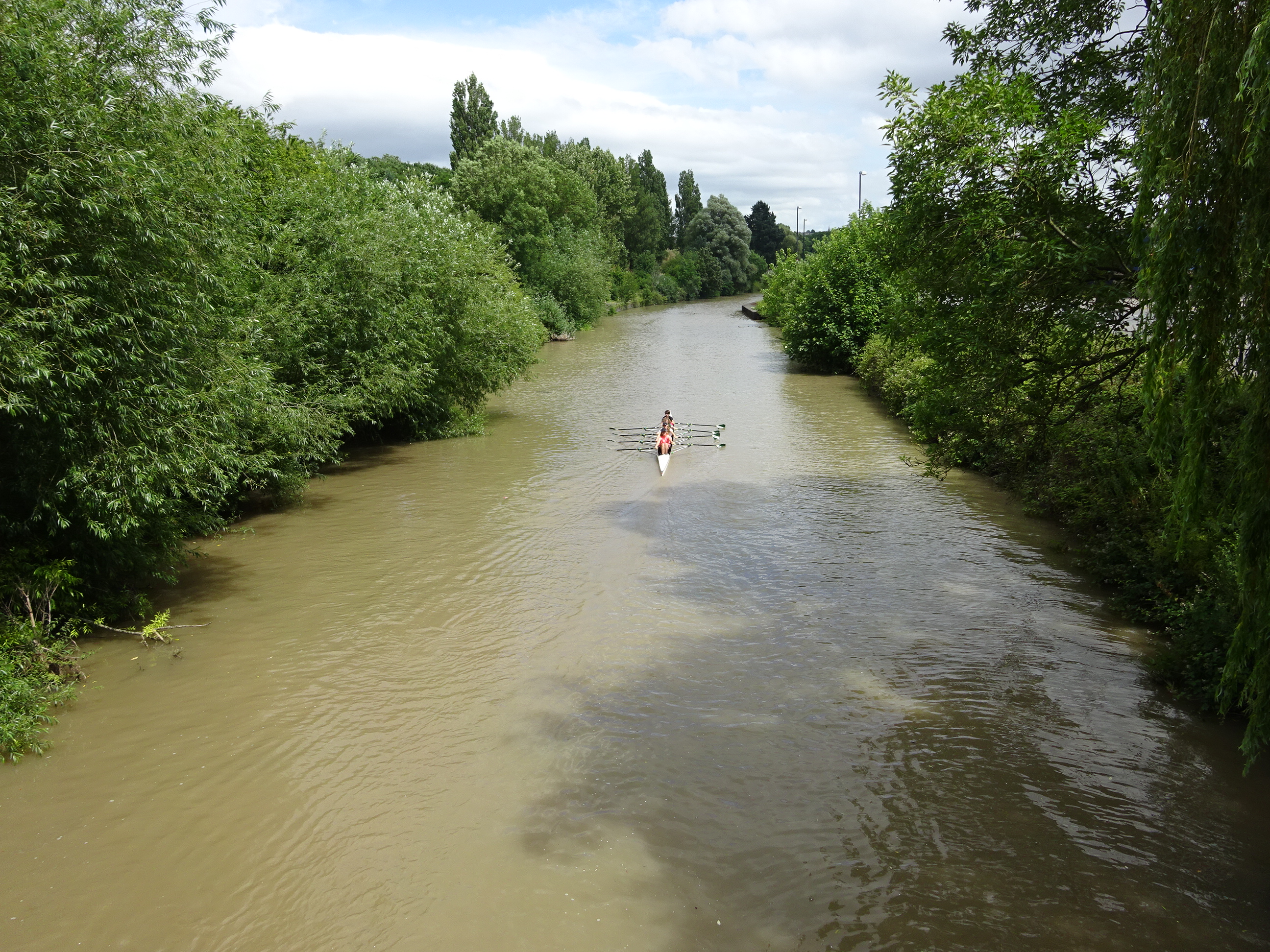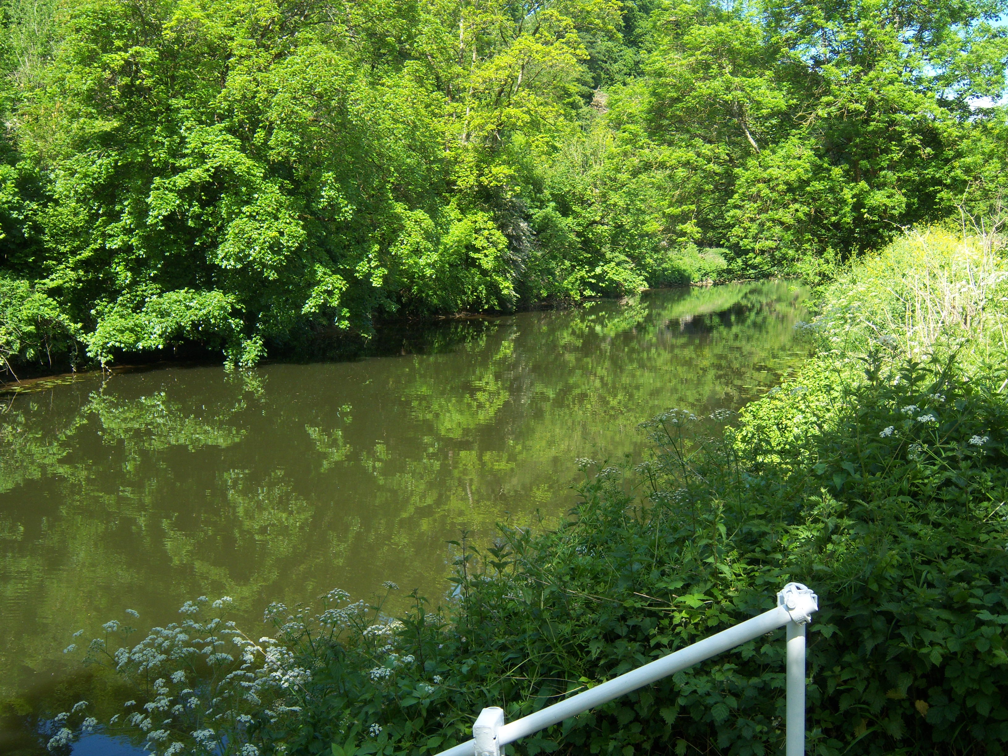 | The view upstream from the Albert Road railway bridge. This bridge mostly carries freight. There is pedestrian access from Victor Street, and from the Bath Road. |