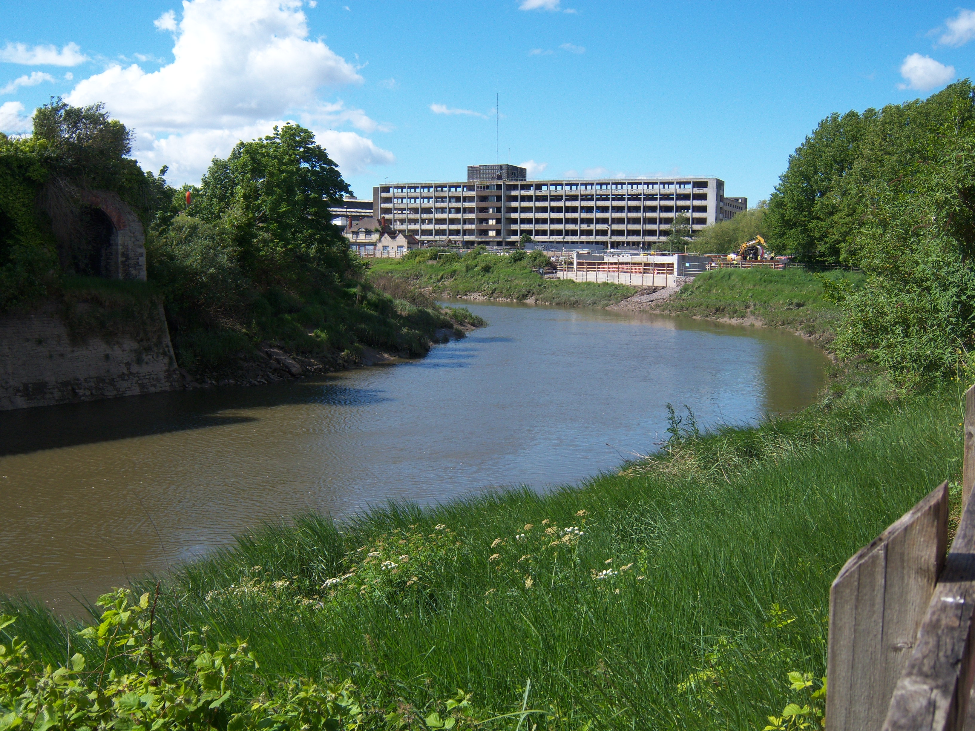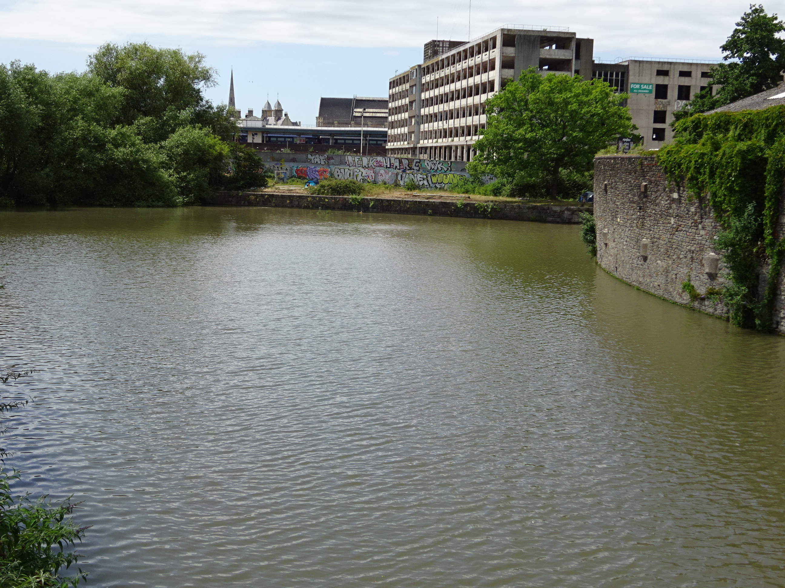 The River Frome (historically, the Froom) flows south-westerly through South Gloucestershire where it meets the Avon in the middle of Bristol. Originally it flowed around the walls of the ancient town and joined the Avon just downstream from the Bristol Bridge, a tributary of it forming the moat of the medieval Bristol castle. Its course was later changed to flow along what is now Marsh Street and, later again, it was redirected to pass through what Bristolians call "The Centre", meeting the Avon at St Augustine's Reach. It was crossed by a drawbridge roughly where Clare Street meets Broad Quay, and ships would be docked right up to what is now "Electricity House" on the corner of Quay Street and Rupert Street. In later years different parts of the river were culverted over; it now disappears underground where Wade Street passes the new Cabot Circus, reappearing next to Cascade Steps at the southern end of The Centre. The castle is long gone, but the moat still exists - almost totally undergound except for a very short stretch that disappears into the darkness at Kings Orchard, just to the southeast edge of Castle Park by some modern redbrick offices.